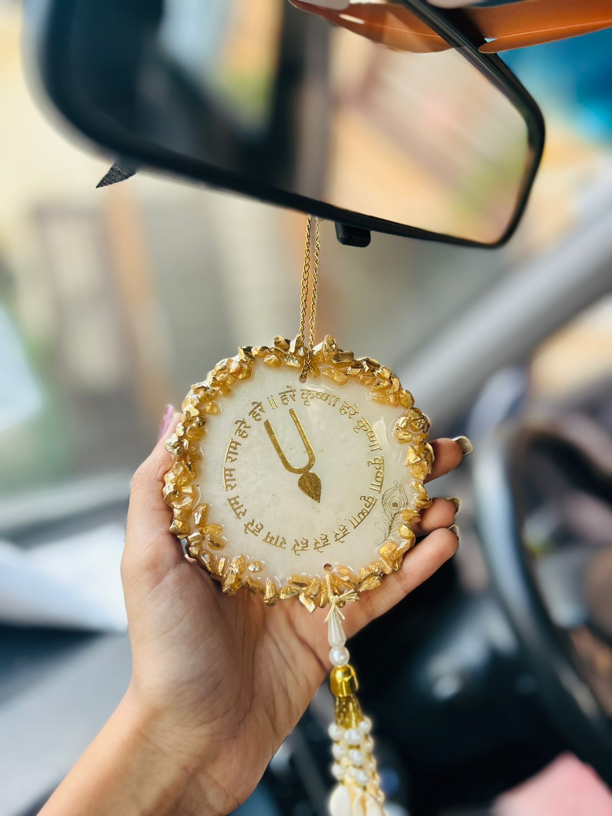 One side features a beautifully painted Radha Krishna photo, symbolizing eternal love and devotion, while the other side displays a sacred mantra to bring peace, positivity, and protection during every drive.